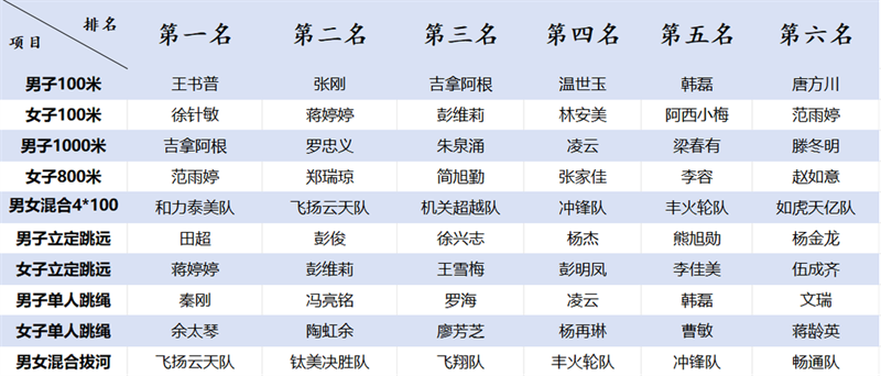 本次运动会设有男子100米、女子100米、男子1000米、女子800米、男女混淆4*100米、男子立定跳远、女子立定跳远、男子单人跳绳、女子单人跳绳、男女混淆拔河10个角逐项目,,,,,,,,既有磨练团队协作能力的整体项目,,,,,,,,也有展现小我私家风范的单项角逐,,,,,,,,充分调动了员工们的加入热情。。。。。